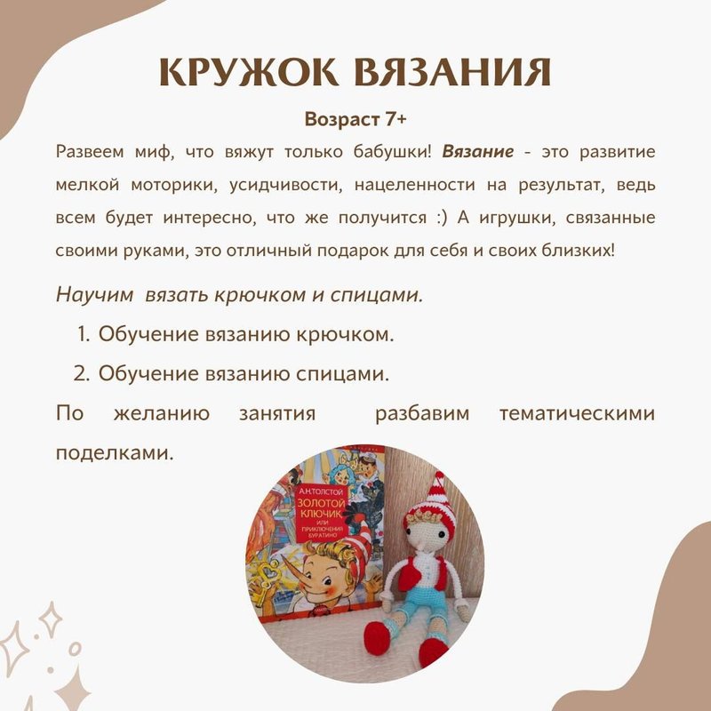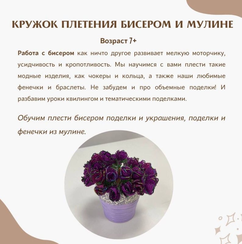 Чем еще мы можем быть вам полезны? Еще мы организуем курсы бисероплетения, вышивки, вязания и шитья - приходите и оцените! Все это разнообразие - для того, чтобы вы развивались и получали настоящее удовольствие от жизни!